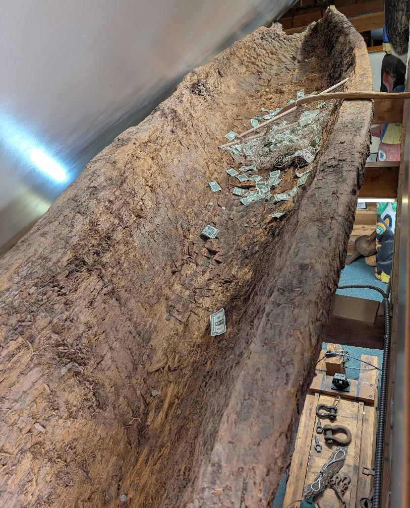 You better believe we have chainsaws! We also have a bunk house, a cook house, pioneer and farming displays, homestead display, movie theater, and tavern. As well as some of the most amazing and intricate handmade models you will ever see. The museum is also home to a wide variety of paintings, art displays, and artifacts. Read about the amazing sapsucker tree. See the magnificent rack of the Northrup bull and the unfinished Native American dugout canoe that was lifted into place during museum construction. And then the roof was put on the museum! Click on the small images below to view them larger.